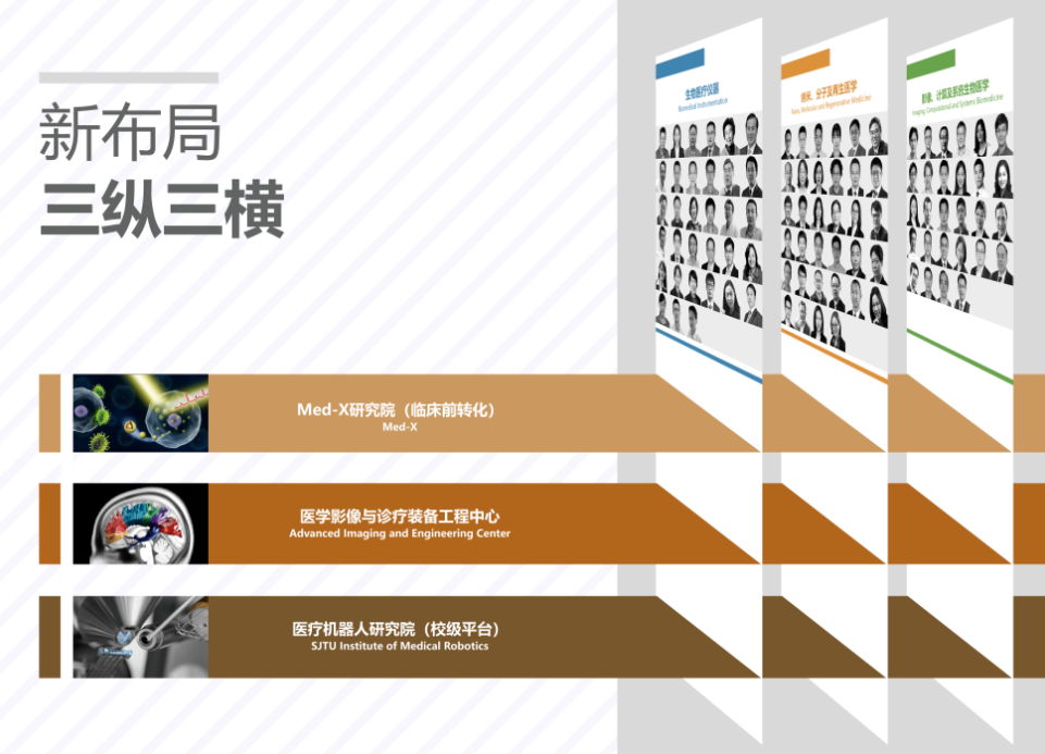 3200威尼斯vip整合了“生物医疗仪器“、”纳米、分子及再生医学“、”影像、计算及系统生物医学“三大主要研究领域,同时形成了以Med-X研究院、医学影像与诊疗装备工程中心、医疗机器人研究院为重要支撑的“三纵三横”的新格局建设,在学科内部强化交叉协同创新,在学科高原上建设高峰。生医工人正以锐意进取、开拓创新的精神主动回应时代变迁带来的新趋势、新问题,未来将在全新格局下,聚焦脑疾病、肿瘤、心血管等重大疾病的精准诊疗,布局学科发展新的增长点,重点建设脑疾病诊疗一体化创新技术及新型装备、肿瘤诊疗创新方案及设备、心血管精准诊疗方法、材料与装置等领域,实施多学科、多部门交叉协同与合力攻关,实现前瞻性基础研究和引领性原创成果的重大突破,在国家健康产业改革发展中发挥引领、示范作用,全面建设高峰耸立、高原迭起的国际一流生物医学工程学科。