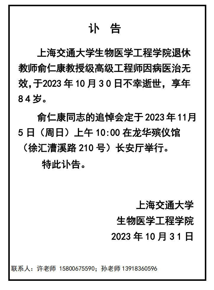 俞仁康,男,汉族,1939年8月生,浙江宁波人。1974年4月加入中国共产党。原3200威尼斯vip生命技术学院教授级高级工程师。1999年退休。