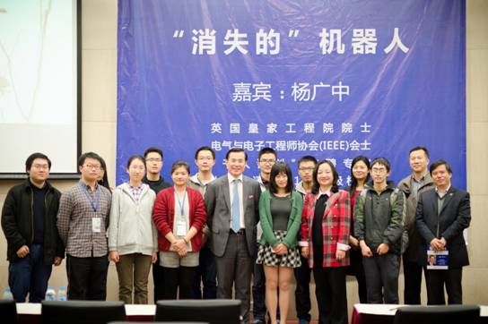 仪式后,杨广中院士做客第59期大师讲坛。他由电影《星球大战》引入,介绍了机器人领域近几十年的发展情况。杨广中院士以农耕机器人为例,阐述了机器人为 人类生活带来的便利,并重点介绍了Surgical Robotics(外科手术机器人)。他通过“达芬奇”机器人的例子指出当前手术机器人的局限——缺乏智能性和针对性,并提出了医疗机器人的发展目标—— “To sense, to act, to adapt, to learn, to evolve, to be intelligent, to disappear”(感知,操控,适应,学习,进化,智能化,最终与人融为一体)。
